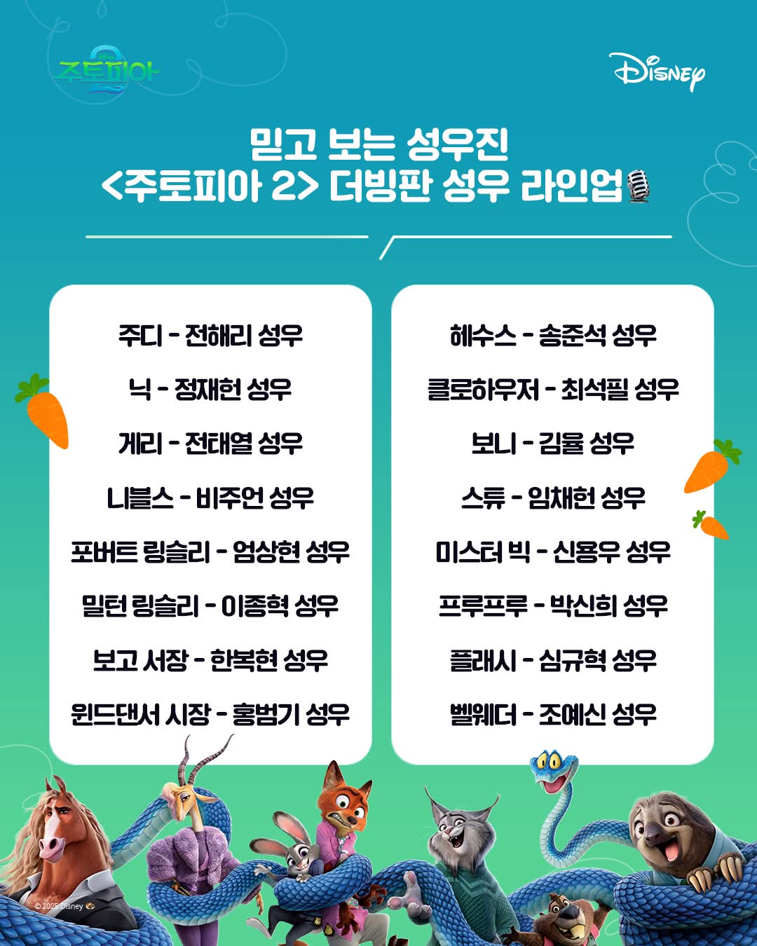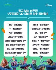 | 2025년 11월 24일 (월) 20:08 | 주토피아 2 더빙판 성우 라인업.jpg (파일) | 140 KB | 아모가이 | 주토피아 2 성우진 | 1 | |